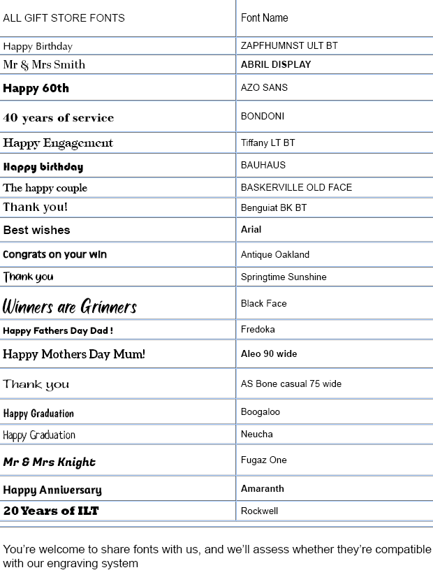 We offer a selection of carefully curated fonts for our personalised gifts — the same trusted styles we've used for over 20 years. These fonts have been chosen for their clarity and precision, ensuring your item is engraved with the utmost care.