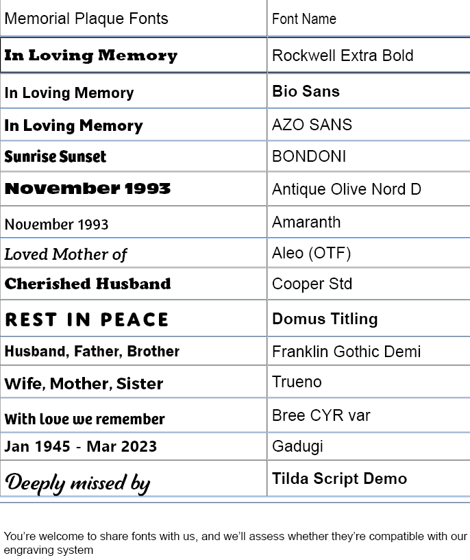 Our recommended fonts work beautifully on our memorial plaques due to their readability and clean finish.