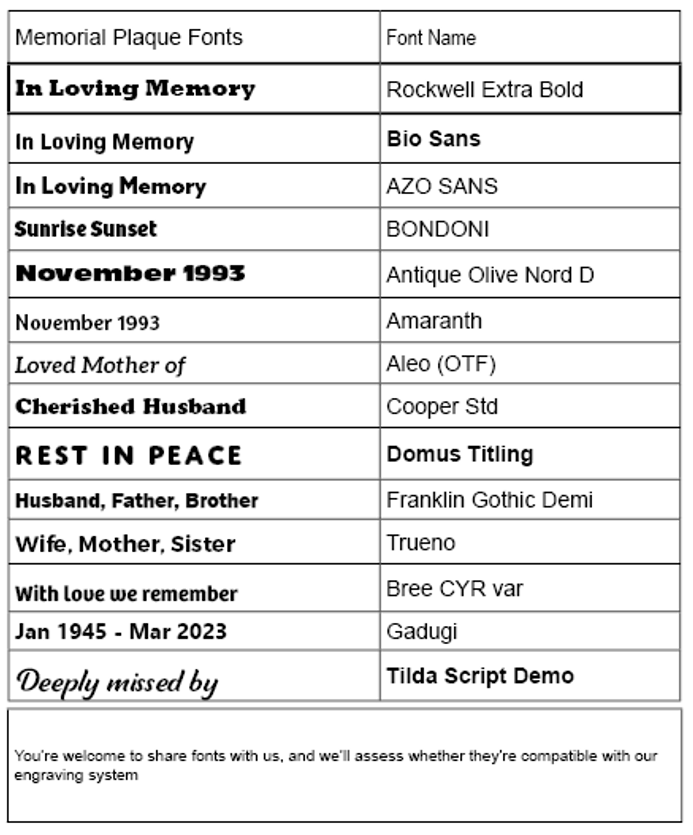 We offer a wide range of font options for inscriptions, from timeless serif styles to contemporary script fonts.