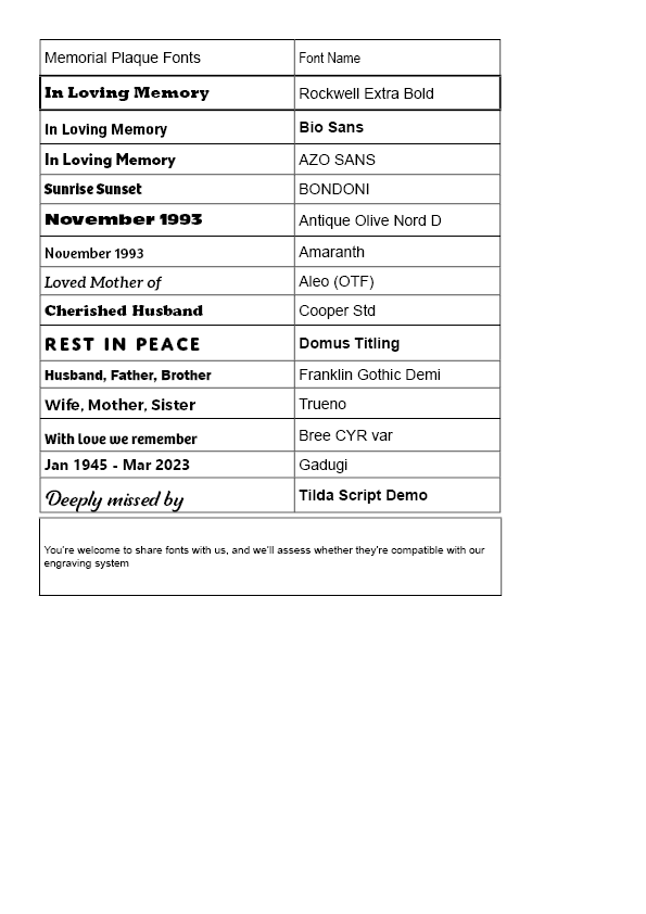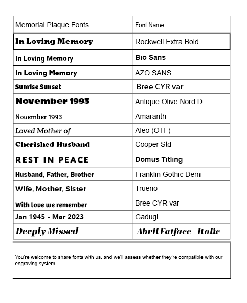 We offer a wide range of font options for inscriptions, from timeless serif styles to contemporary script fonts.